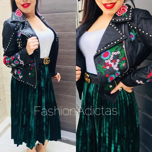Chamarra tipo gucci negra en vinipiel cierre al centro con aplicación de estoperoles en cuerpo y mangas y bordado floral en mangas frente y espalda.