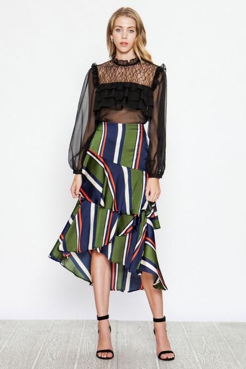 Falda Rayada en tonos verdes irregular, ondulada al frente tipo rufle, cierre en costado.