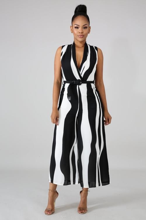 Jumpsuit enterizo sin mangas escote tipo “V”, largo arriba del tobillo, estampado en tonos negro y blanco con cinturón entretejido incluido, cierre.