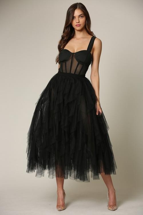 Maxi vestido de tulle multicapas con corsette copa preformada de satin tirante grueso con transparencia, cierre.