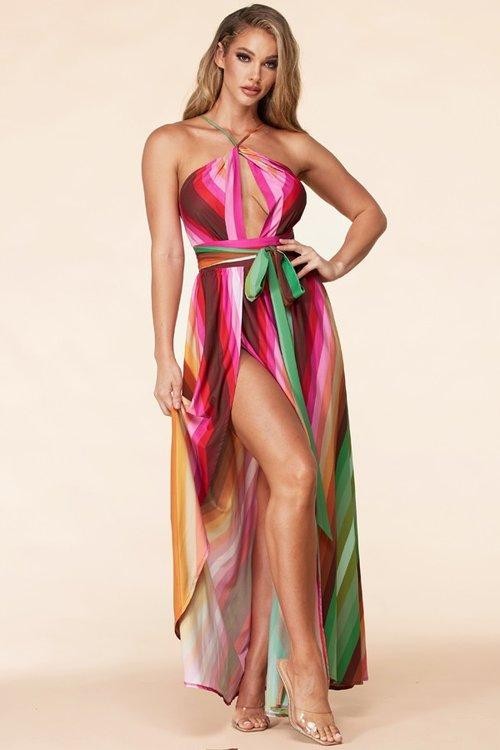 Maxi vestido tipo haltercintillas cruzadas aberturaen ambas piernas cinturon de tela estampado rayado multicolor.